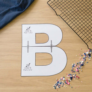 Our print at home letter shaped cookie cake number templates are 28cm / 11" tall and have been made especially so that you can print them out on your home printer with your regular size paper. Simply print them, cut them out and join them and they are ready to use. You then trace around your desired shape onto baking or parchment paper to be transferred to the top of your cookie shape and cut out.